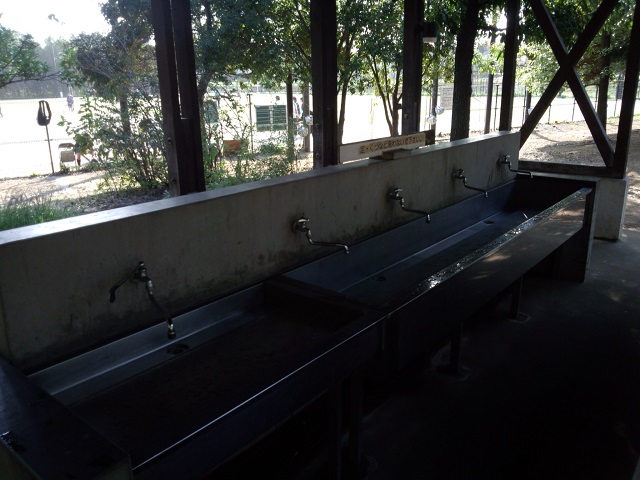 施設内には炊事棟、かまど10基、流し(蛇口9か所、身障者用1か所)、作業台6か所、手洗い場2か所などが完備されており、備え付けのテーブルやベンチもご利用いただく事ができます。機材につきましては、現地での貸し出しなどはありませんので、事前にご用意いただくか、レンタルをご利用いただく事をお勧めいたしております。